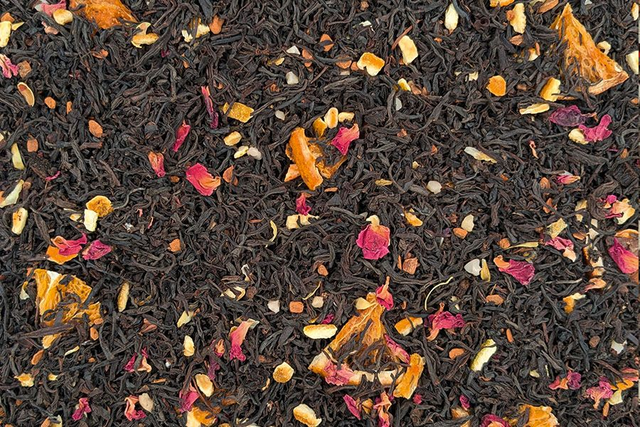 Ingrédients: thé noir, cannelle, tranches d’orange (5 %), zestes d’orange (5 %), arôme, amandes, pétales de roses, clou de girofle, graine de cardamome, vanille.