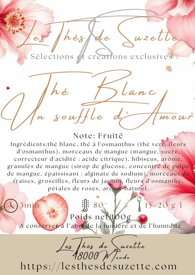 Ingrédients : Thé blanc, thé à l'osmanthus (thé vert, fleurs d'osmanthus), morceaux de mangue (mangue, sucre, correcteur d'acidité : acide citrique), hibiscus, arôme, granulés de mangue (sirop de glucose, concentré de pulpe de mangue, épaissisant : alginate de sodium), morceaux de fraises, groseilles, fleurs de jasmin, fleurs d’osmanthe, pétales de roses, arôme naturel.